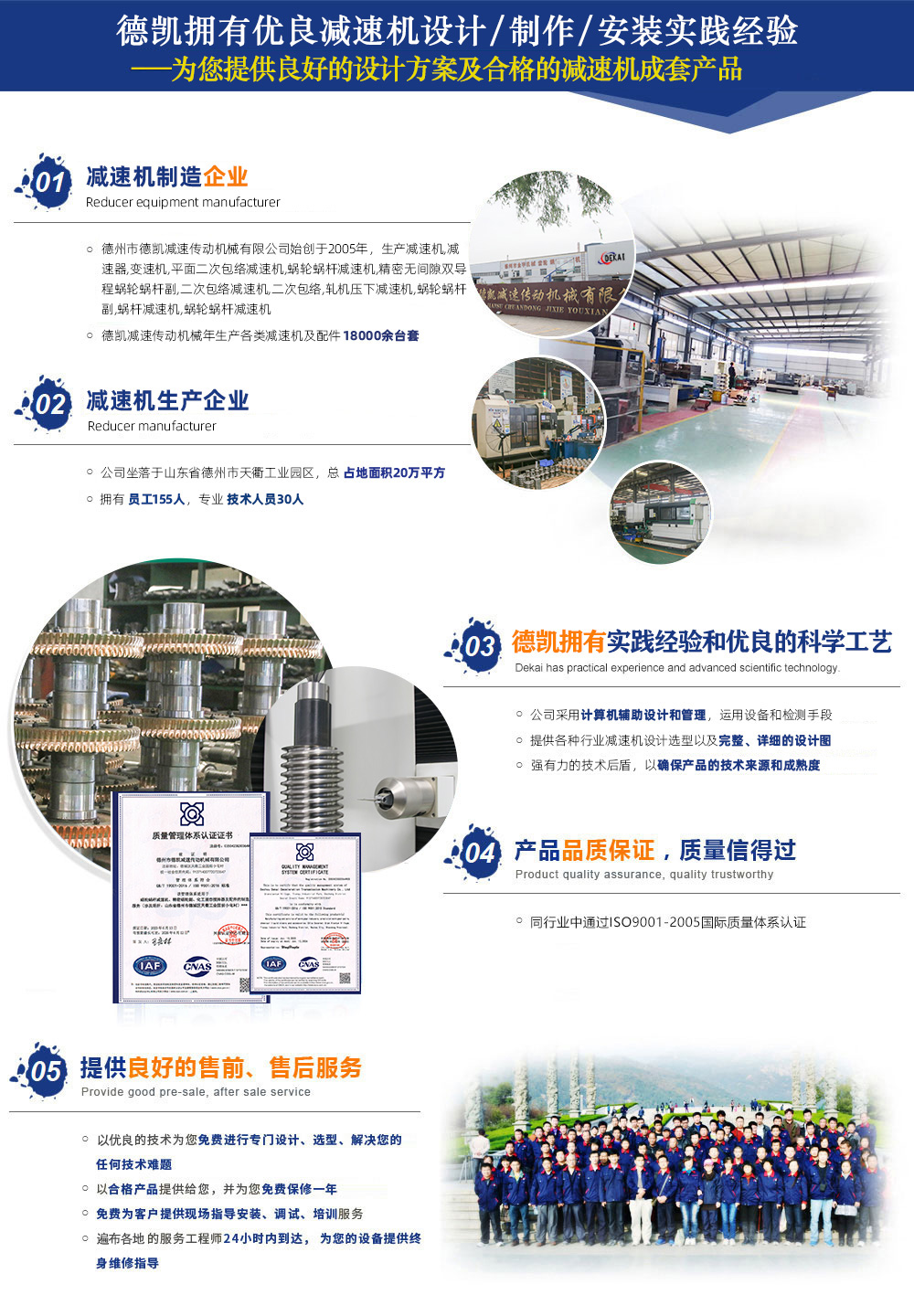九州在线(中国)唯一官方网站,生产减速机,减速器,变速机,平面二次包络减速机,蜗轮蜗杆减速机,精密无间隙双导程蜗轮蜗杆副,二次包络减速机,蜗轮蜗杆,轧机压下减速机,蜗轮蜗杆副,蜗杆减速机,蜗轮蜗杆减速机,公司占地面积20万平方,员工155人,技术人员30人,年生产各类减速机及配件18000余台套。在同行业中通过了ISO9001质量管理体系认证。公司设备齐全、技术力量强大、检测手段完善,引进国外大型数控二次包络机床GJK75加工数控4台,可加工到800二次包络蜗轮蜗杆。引进汉江S7732蜗杆磨床3台,精度可达5级。公司拥有辉光离子氮化炉4台,经该设备氮化后可提高蜗杆表面硬度、耐磨性高、提高疲劳强度、变形量小、耐蚀性、...