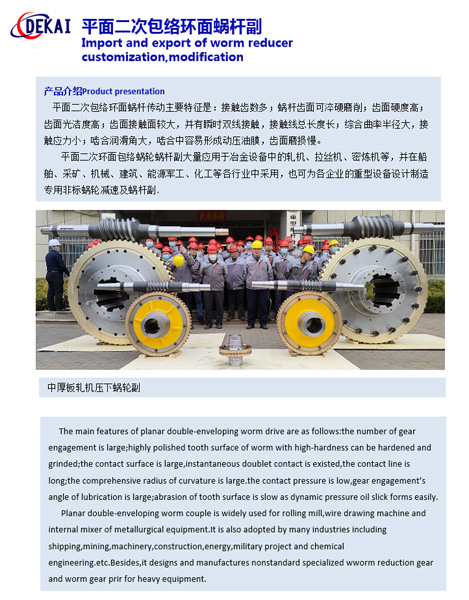 平面包络换面蜗杆减速器是一种新兴的传动装置,其承载能力大,传动效率高,结构紧凑,合理。这种减速器可以广泛地应用于各种传动机械中的减速传动,如冶金,矿山,起重,化工,建筑橡塑船舶等行业以及其它机械设备上,适用工作环境温度为-40°C~+40°C,输入轴转速不大于1500/分,蜗杆轴可正反两面方向旋转。